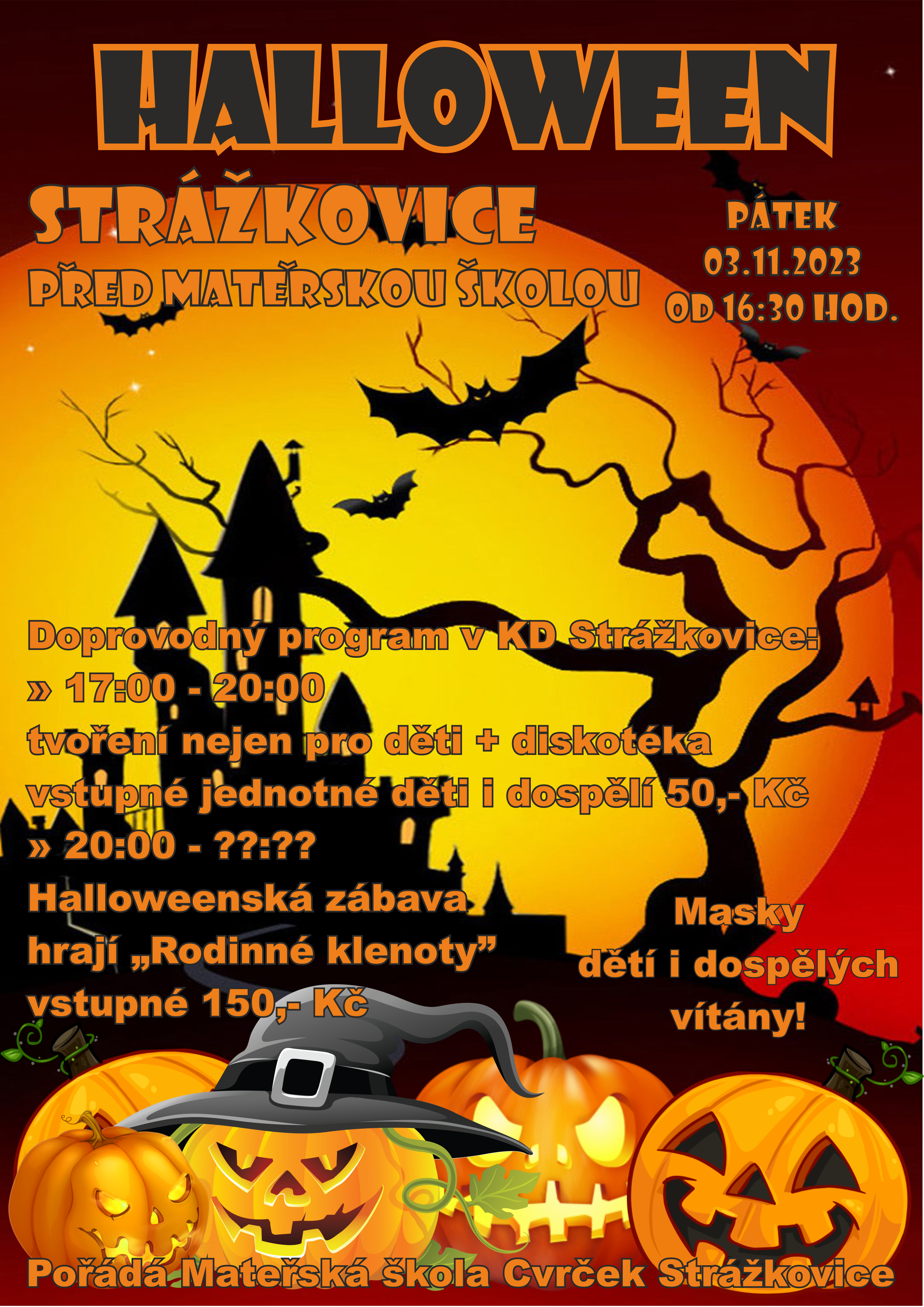 Mateřská škola Cvrček Strážkovice zve všechny nebojácné děti i dospělé na Halloweenskou cestu za dobrodružstvím, která se uskuteční dne 3.11.2023 od 16,30 hod.