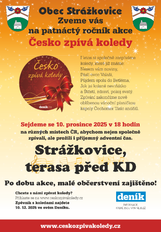 Obec Strážkovice za podpory Deníku, Vás srdečně zvou na patnáctý ročník akce "Česko zpívá koledy"