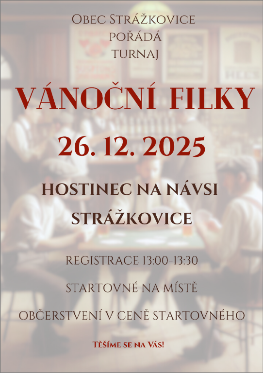 Obec Strážkovice pořádá v pátek dne 26.12.2025 v "Hostinci Na Návsi" ve Strážkovicích Vánoční karetní turnaj ve hře FILKY.