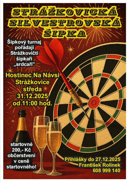 Oddíl Strážkovičtí šipkaři "Srdcaři" pořádají pod záštitou obce Strážkovice Silvestrovský šipkařský turnaj .