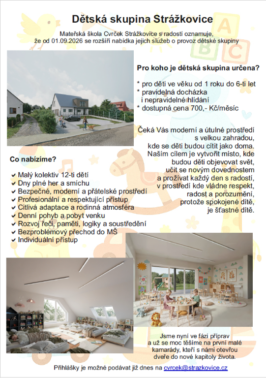 Obec Strrážkovice informuje o přípravě provozu Dětské skupiny Strážkovice, jejímž provozovatelem je Mateřská škola Cvrček Strážkovice - příspěvková organizace obce Strážkovice. Budova dětské skupiny se nachází v místě bývalé prodejny Jednota na návsi ve Strážkovicích čp. 42. Přestavbou nevzhledné budovy v havarijním stavu vznikne nové dominanta návesního prostoru, která doplní služby pro rodiny s dětmi. Moderní stavba s nízkoenergetickým provozem a velkým zahradním prostorem s herními prvky pro nejmenší je určena pro děti od 1 roku do 6-ti let s možností pravidelné docházky i nepravidelného hlídání v malém kolektivu 12-ti dětí.