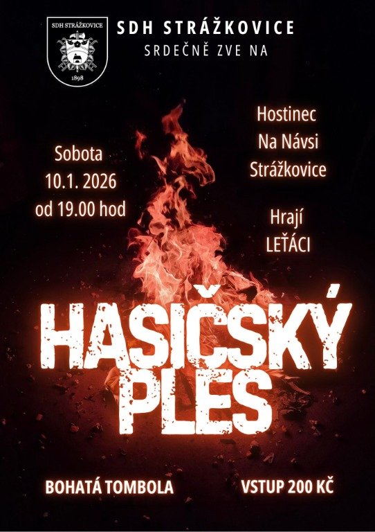 SDH Strážkovice Vás srdečně zve na Hasičský ples, který se uskuteční v sobotu 10.01.2026 od 19:00 hod. v KD Strážkovice.