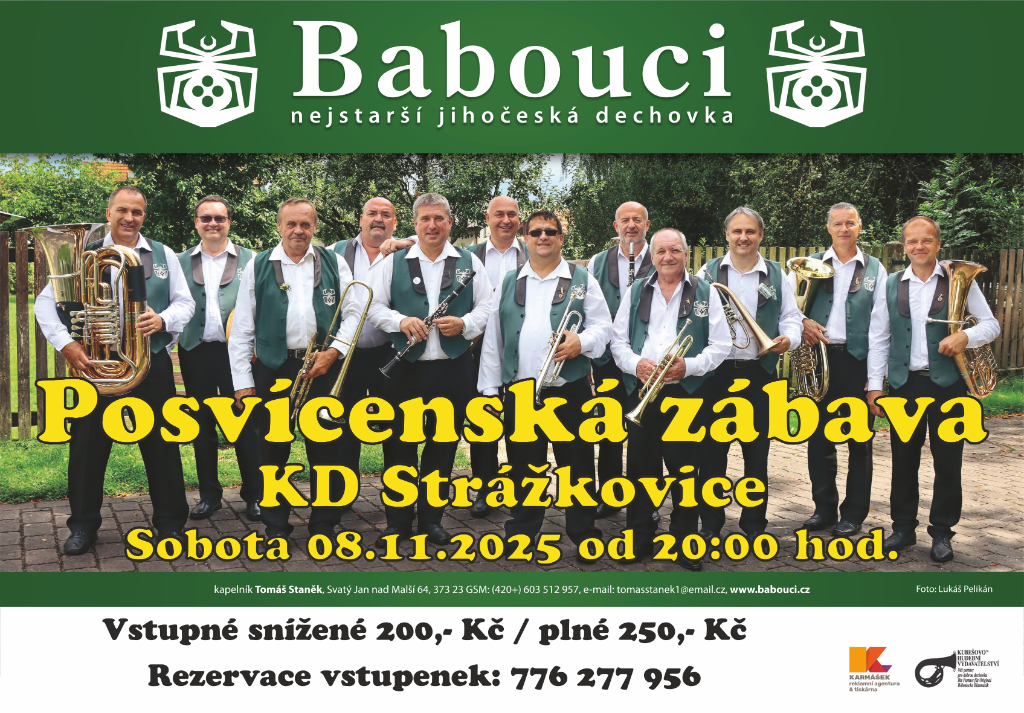 Obec Strážkovice Vás srdečně zve na Posvícenskou zábavu do KD Strážkovice, která se koná v sobotu 08.11.2025 od 20:00 hod., vstupné snížené 200,- Kč /plné 250,- Kč.